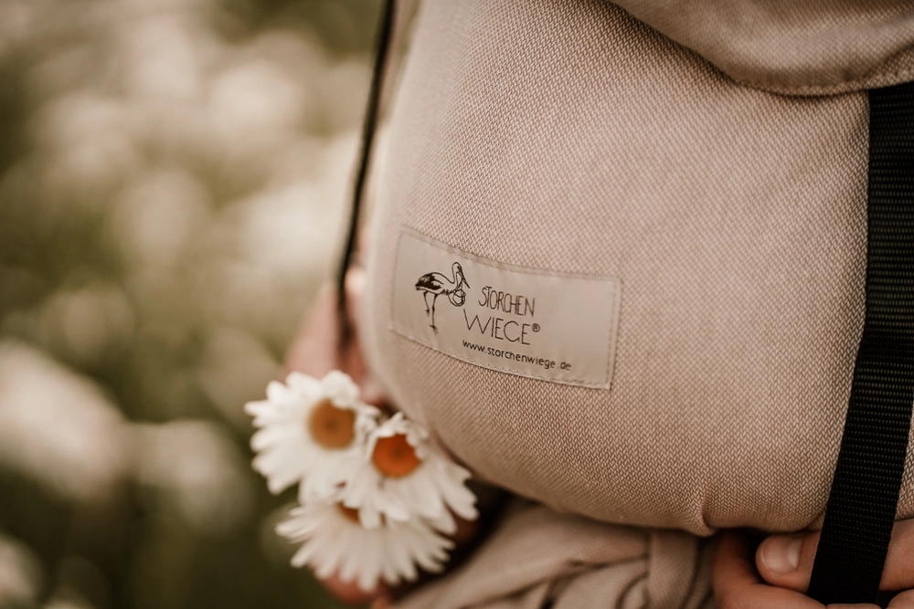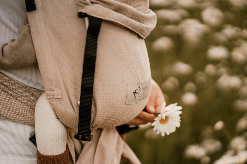 Регулировка притяжения верха спинки малыша, благодаря чему в май-слинге Storchenwiege можно безопасно притянуть к взрослому даже совсем маленьких деток (в рекомендуемом производителем весовом диапазоне)